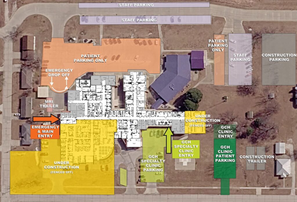 Guthrie Center, Iowa — February 20, 2026 — Guthrie County Hospital is announcing temporary access changes for patients while construction progresses on campus. These adjustments will ensure continued safe and efficient entry to clinic services throughout the construction period. A detailed map illustrating the updated entrances and parking areas is included with this release for patient convenience.
